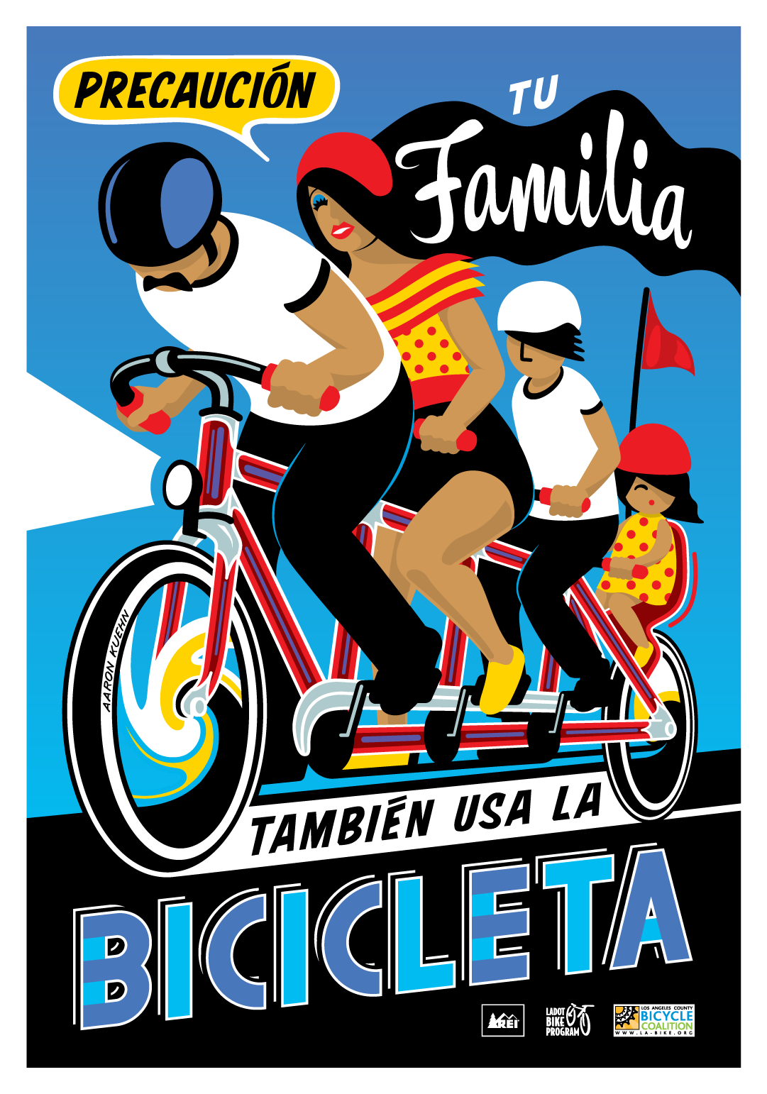 Spanish speakers in Los Angeles ride bikes more than other groups, and also suffer disproportionately from traffic injuries. To create safer streets for everyone, the Los Angeles County Bicycle Coalition - City of Lights Program in partnership with the Los Angeles Department of Transportation - Bikeways and several community groups created a pioneering bicycle safety public awareness campaign in Spanish consisting of bus shelter posters and a video PSA. You can read about the unique grassroots process in Adonia Lugo's excellent book, Bicycle/Race: Transportation, Culture, & Resistance, and the campaign on Streetsblog. My artwork was selected to illustrate the campaign slogan: