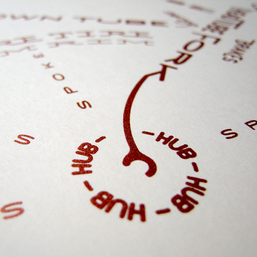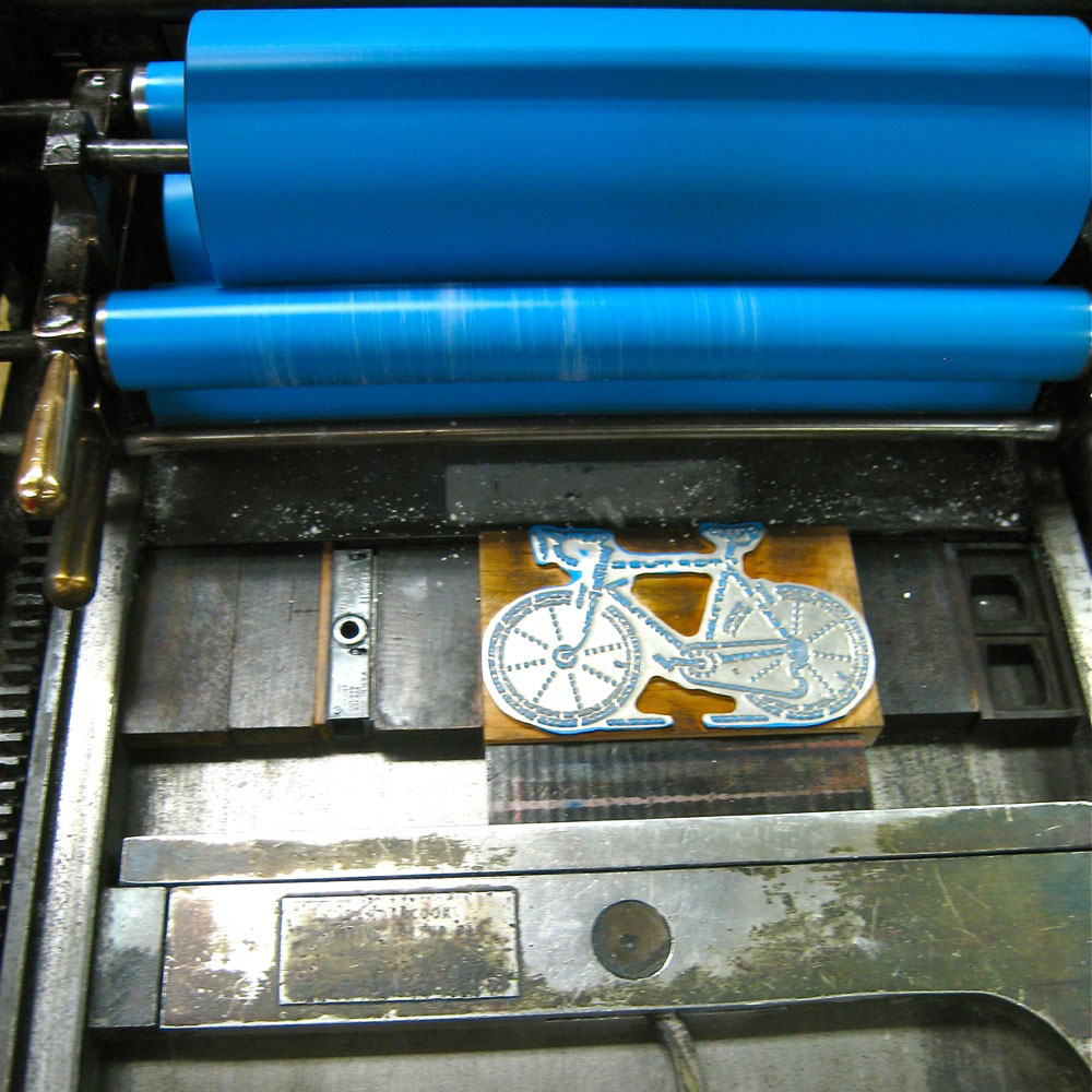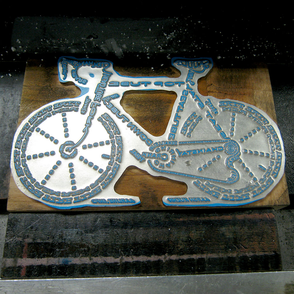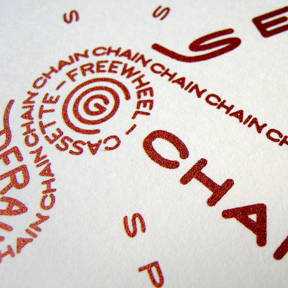 Print...print...print. The Bicycle Typogram is printed. Card, flood, print, pull, dry. Each impression represents a unique moment in time. Registration E tabs, press micro-adjustments, stencil-restricted ink deposits, attempts to make each moment an exact replica - the tick tock of a perfect clock. But perfection is not easily reproduced.