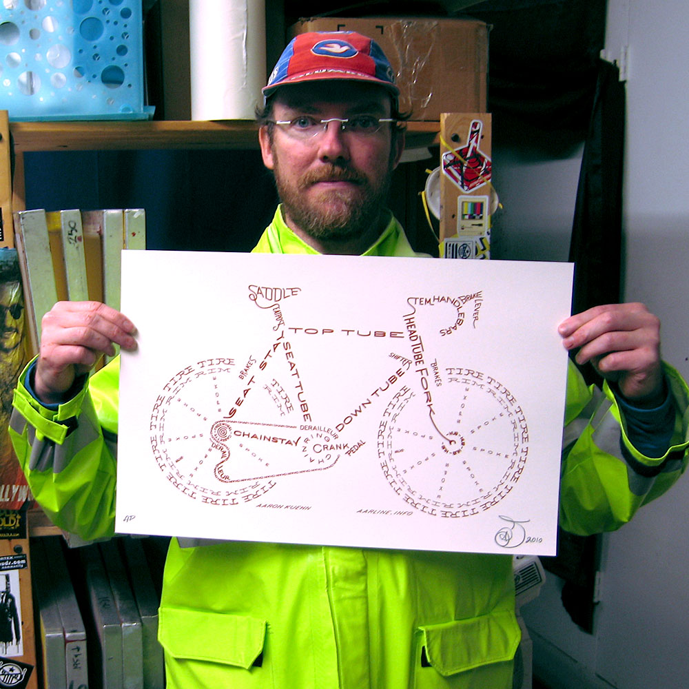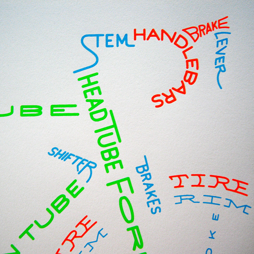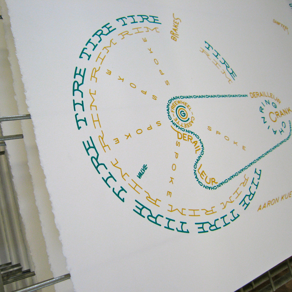 3… 3… 3… The Bicycle Typogram is now printed in 3 colors. A limited edition of 33 prints, hand pulled by me, Aaron Kuehn, as museum quality art specifically for custom framing (to protect the delicate chemistry from the ravages of our harsh planet, and make the formal viewing experience more profound). This edition is unspeakably HOT.