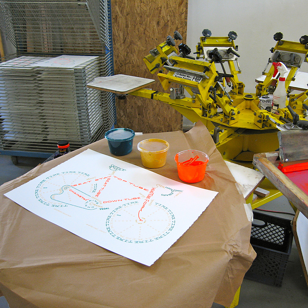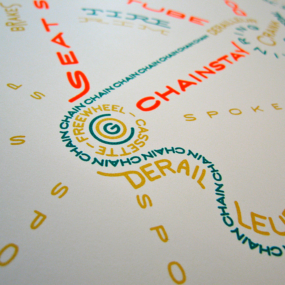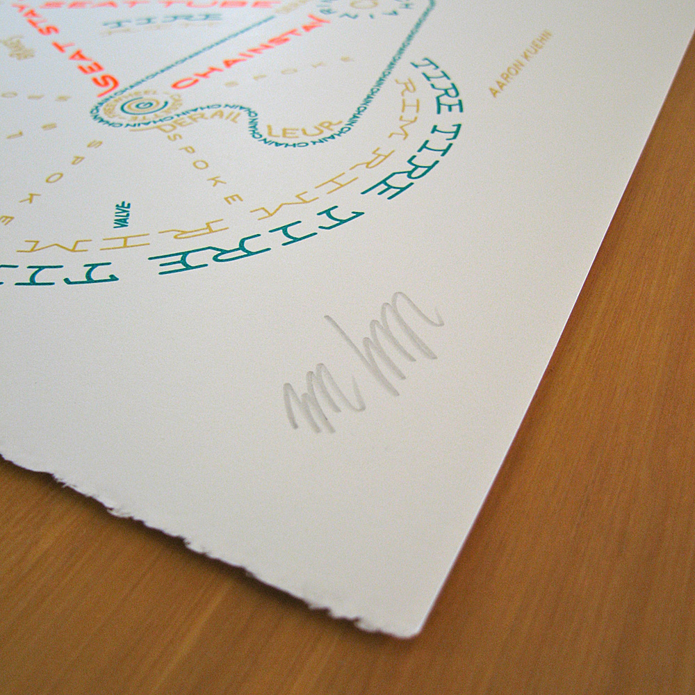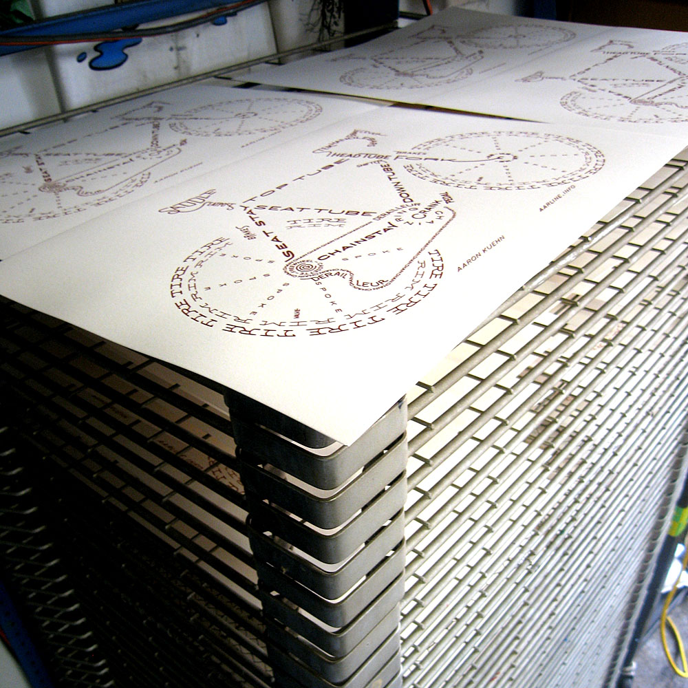 3… 3… 3… The Bicycle Typogram is now printed in 3 colors. A limited edition of 33 prints, hand pulled by me, Aaron Kuehn, as museum quality art specifically for custom framing (to protect the delicate chemistry from the ravages of our harsh planet, and make the formal viewing experience more profound). This edition is unspeakably HOT.
