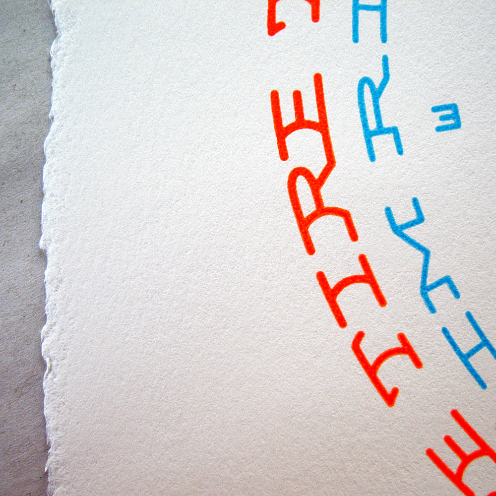 Letterpress printing is the same concept as Johannes Gutenberg's printing 'wine-press' - press the paper onto the inked letters, and after nearly 600 years, still leaves a superior impression to most other methods. The Bicycle Typograms are pressed from magnesium plates (modern), and the Interjections are composed from battered antique wooden type (note the cracks, grain and other artifacts when you view full size).